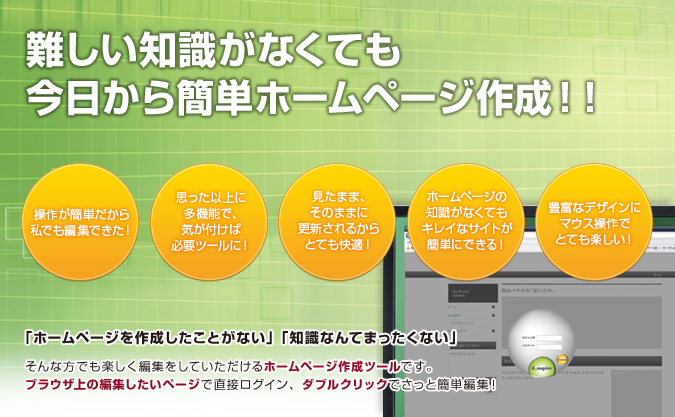 - 一般的なワープロソフトと同じようにHTMLなどの知識がない事務スタッフでも簡単更新!